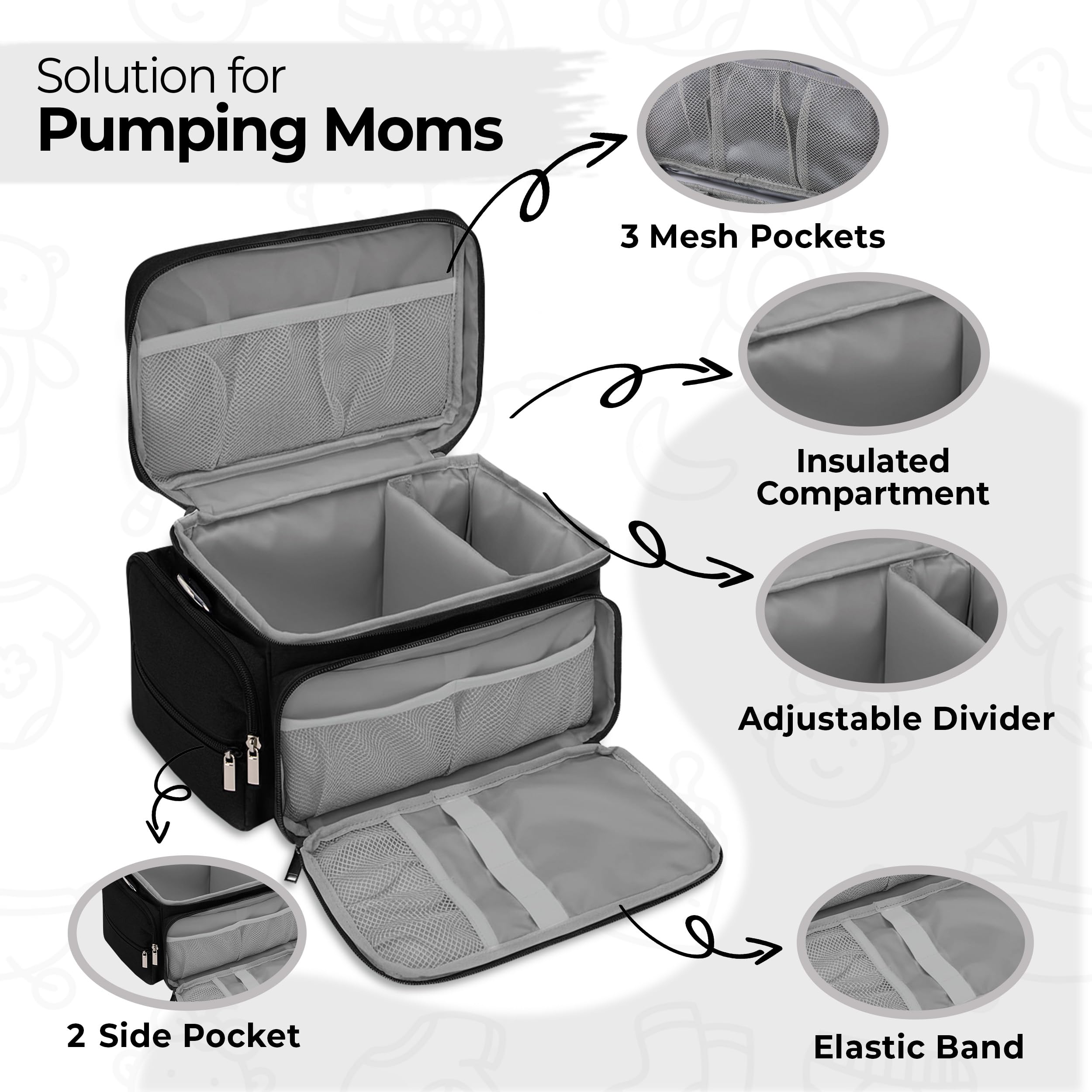 - ✨【𝐋𝐀𝐑𝐆𝐄 𝐂𝐀𝐏𝐀𝐂𝐈𝐓𝐘 & 𝐔𝐍𝐈𝐕𝐄𝐑𝐒𝐀𝐋】: The breast pump bag measures 9 x 8.8 x 15 inches and features multiple independent compartments and mesh pockets to neatly organize breast pump accessories, keys, snacks, and other items while keeping everything clean and hygienic. The front mesh pocket includes an elastic strap for storing bottle brushes, milk storage bags, and other pumping accessories. The side tissue pocket design allows for quick access during busy moments